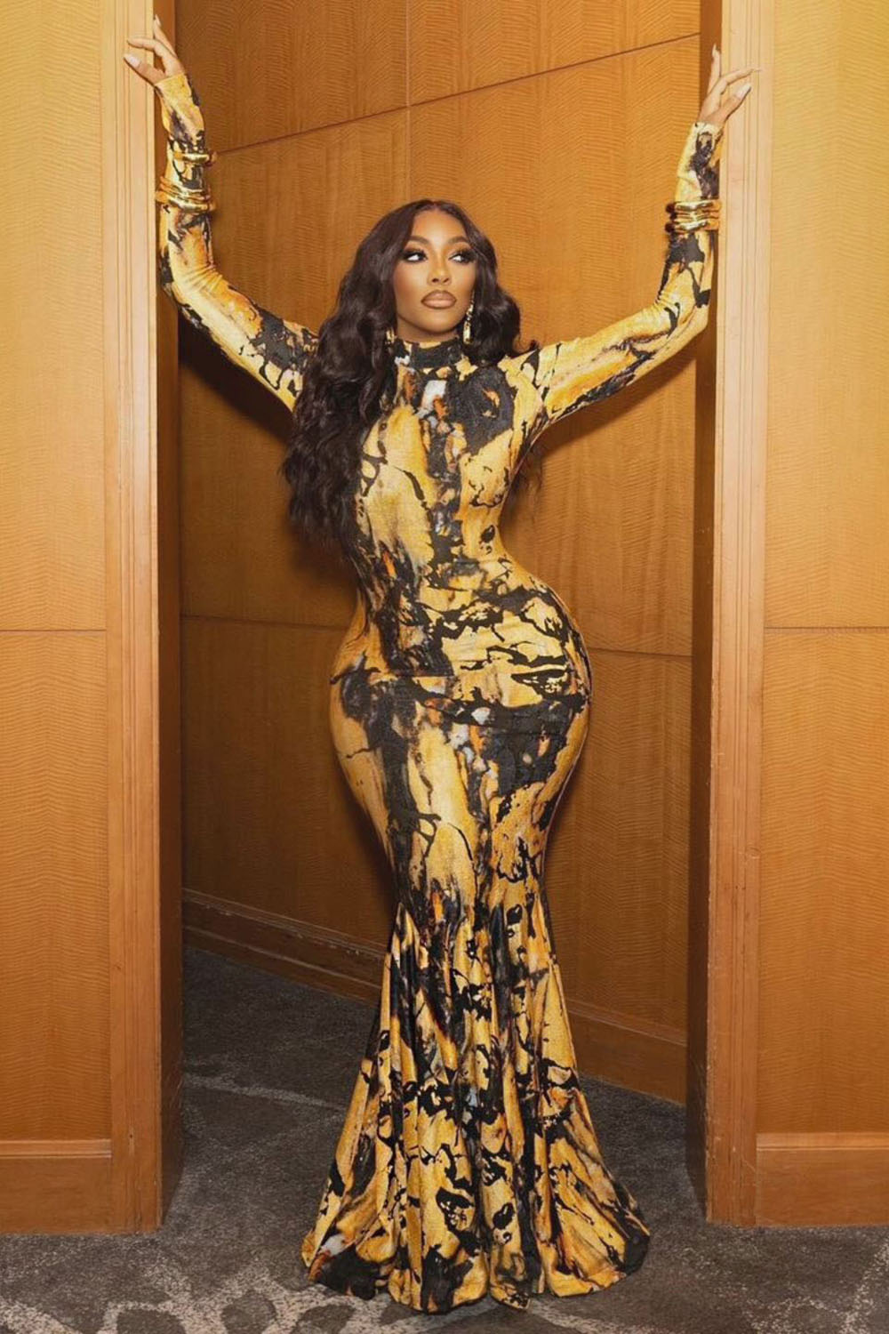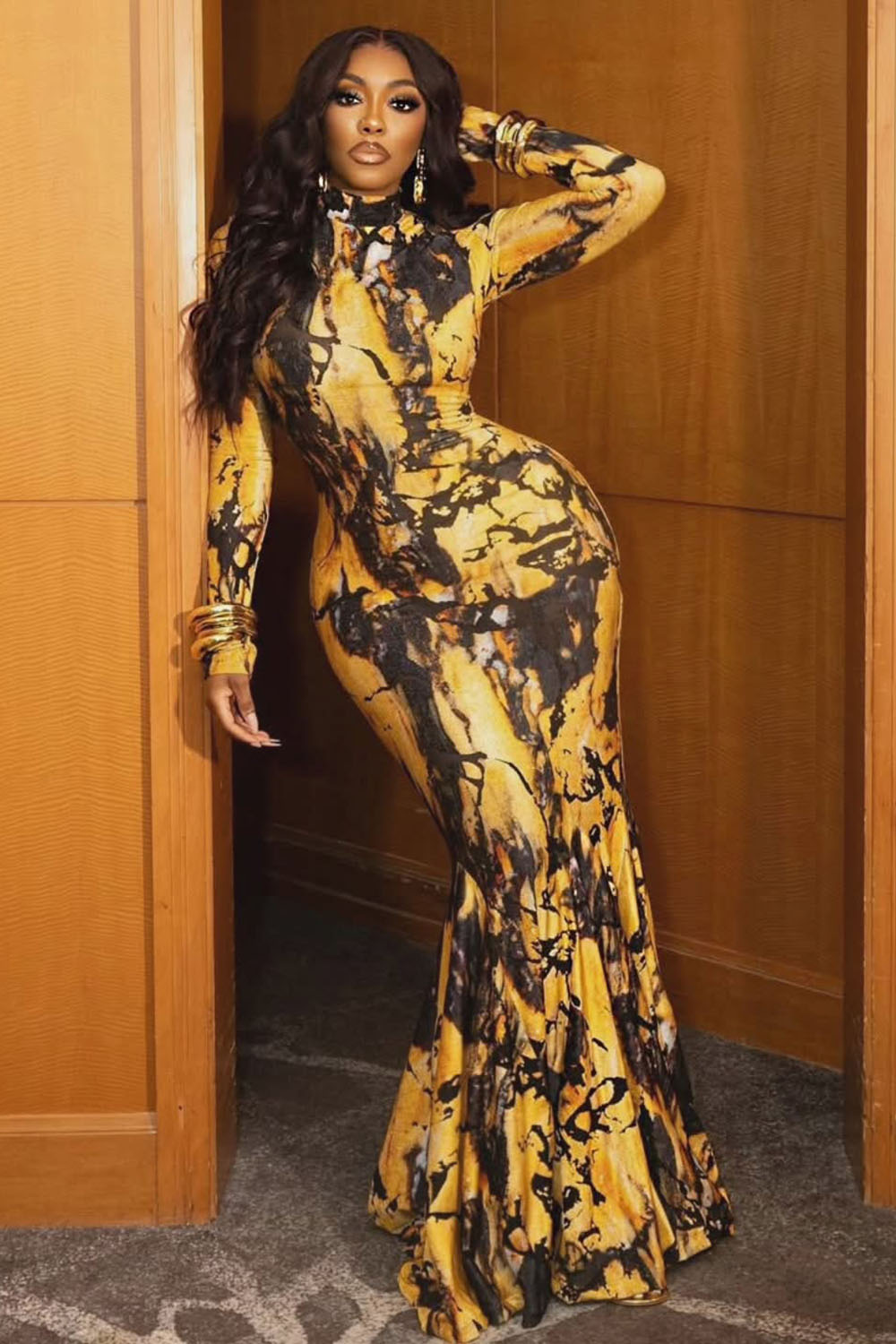 Abstract Print Mock Neck Party Maxi Fishtail Dresses-Yellow [Pre Order]