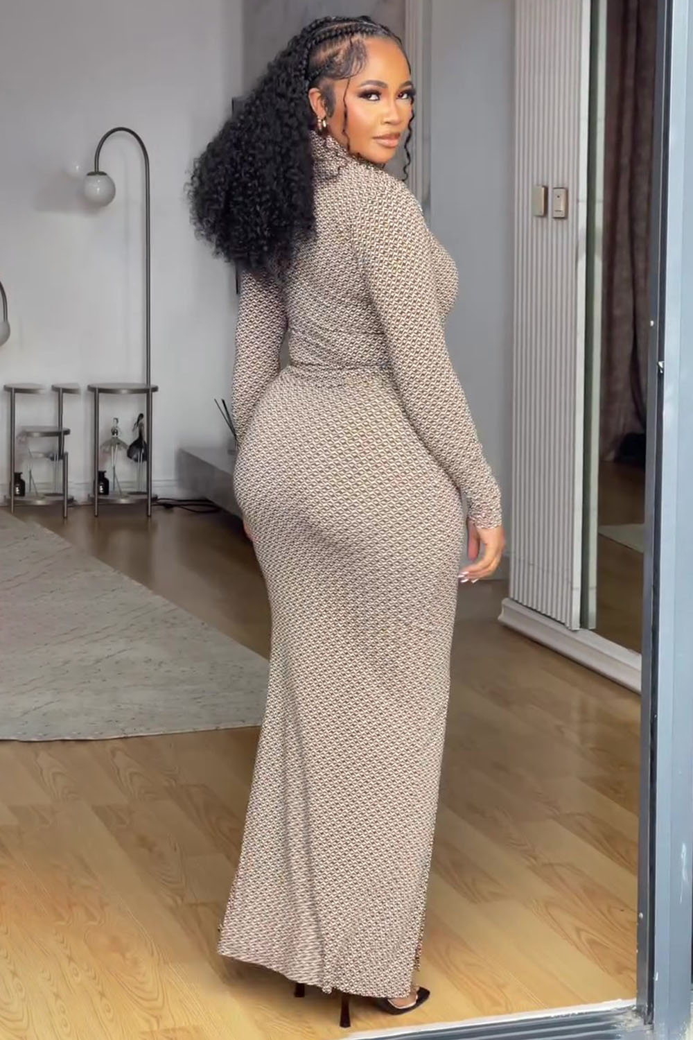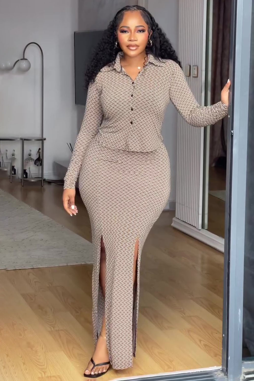 Button Up Top Boho Print Slit Bodycon Maxi Skirt 2pcs Set-Brown [Pre Order]