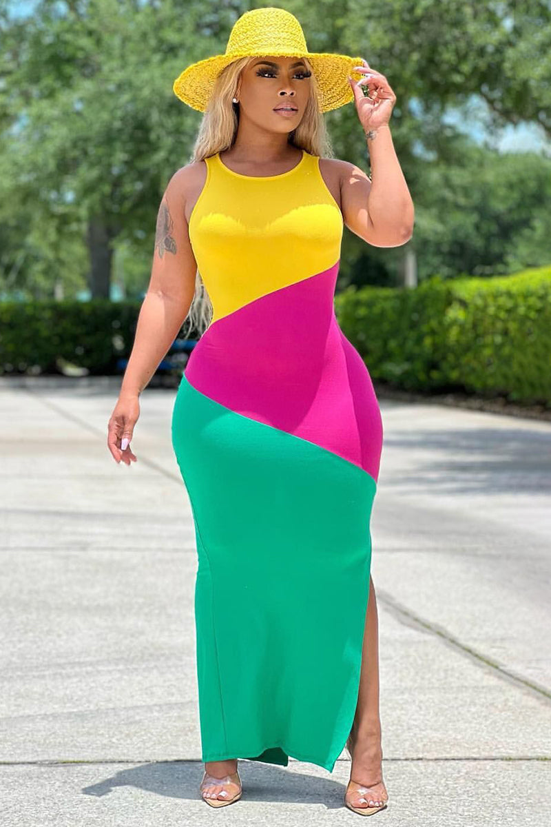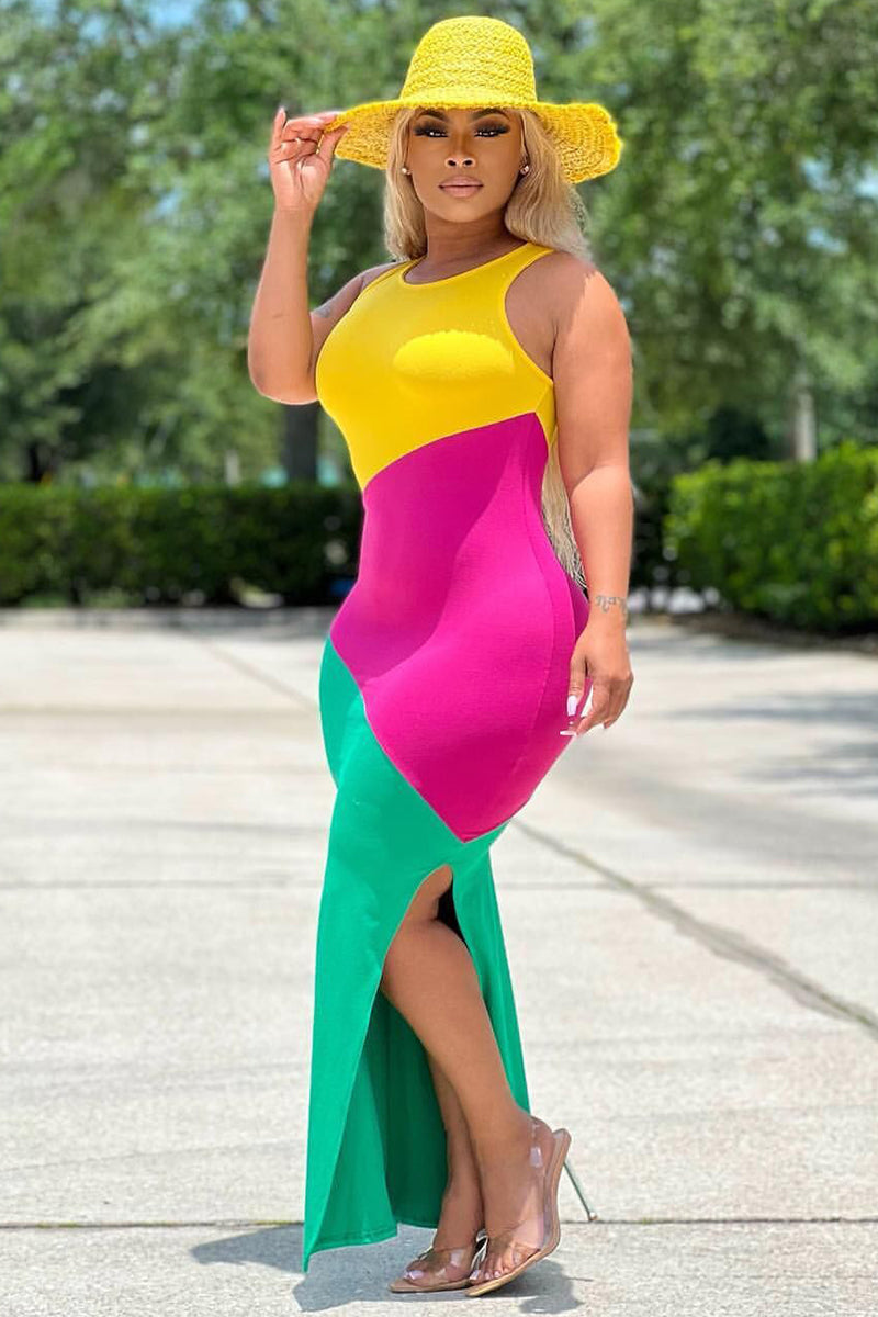 Colorblock Round Neck Sleeveless Slit Bodycon Vacation Maxi Dress