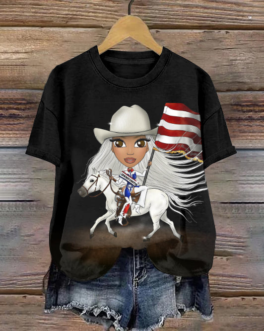 Cute Cartoon Cowgirl Crew Neck Short Sleeve Tshirt