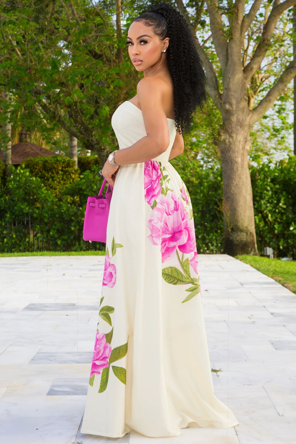 Floral Placement Print Strapless Party Maxi Dresses-Beige [Pre Order]