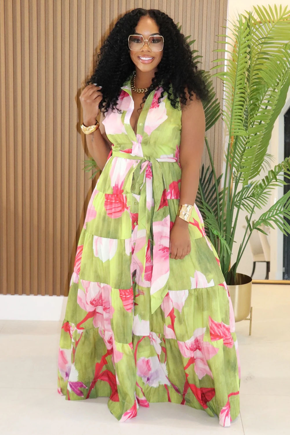 Floral Print Tiered Button Up Sleeveless Maxi Dresses-Green [Pre Order]