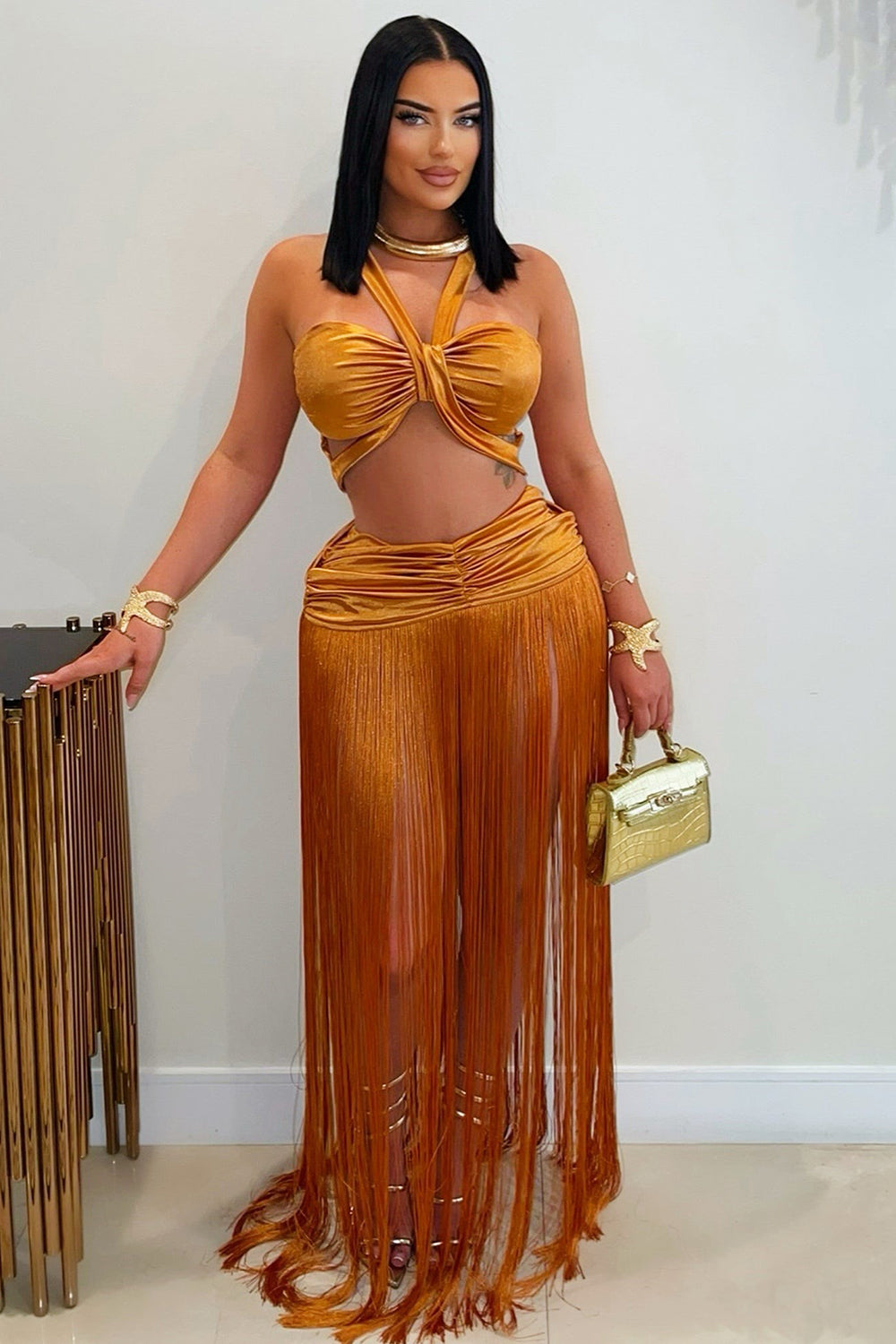 Gathered Halter Crop Top Fringe Maxi Skirt Party 2pcs Set-Orange