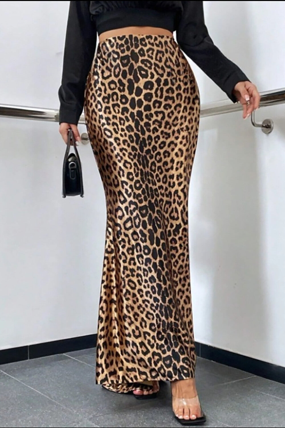 Leopard Print High Waist Fishtail Maxi Skirt-Brown