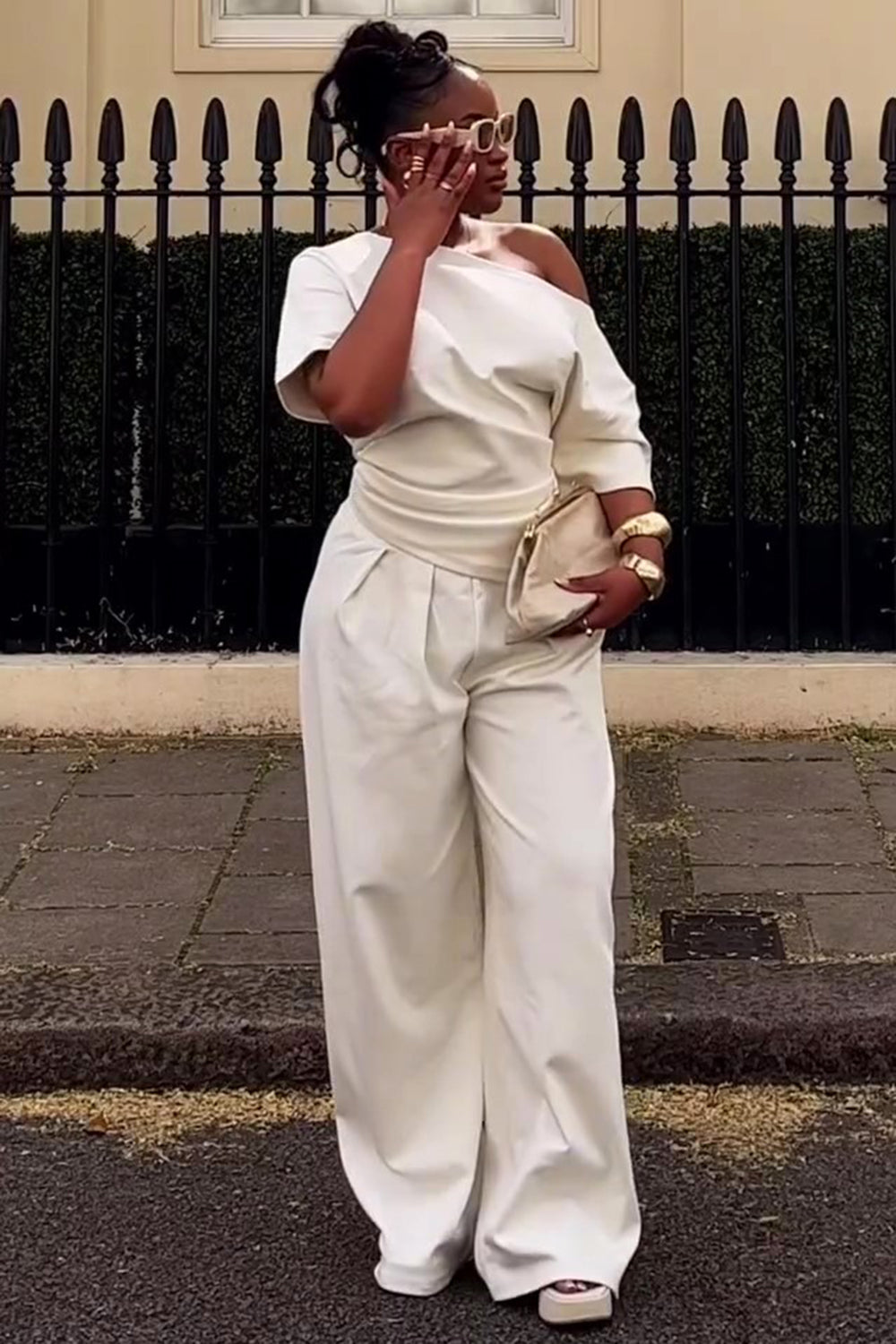 One Shoulder Boat Neck Top Wide Leg Pants Daily 2pcs Set-White [Pre Order]