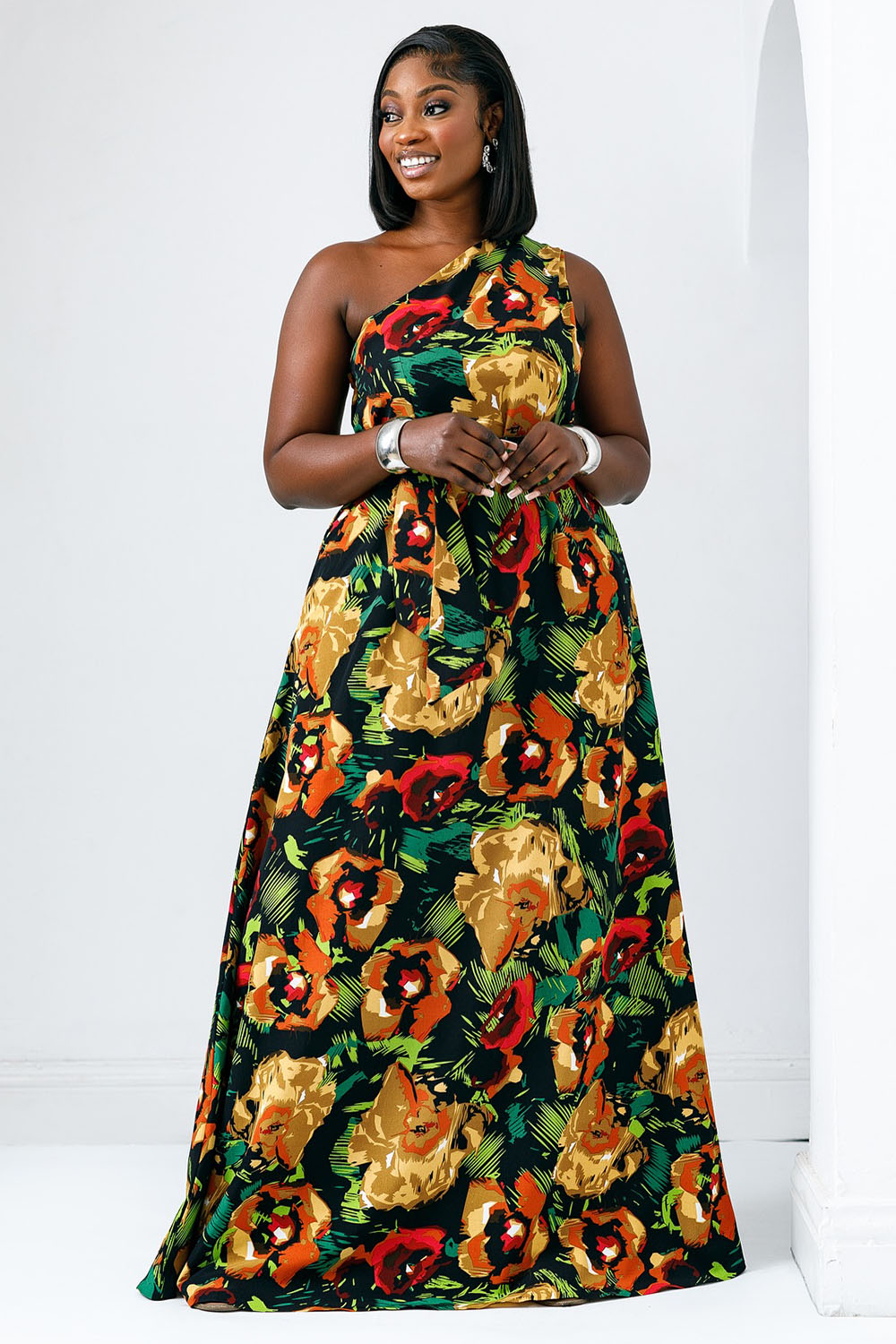 One Shoulder Sleeveless Floral Print Party Maxi Dresses-Black [Pre Order]