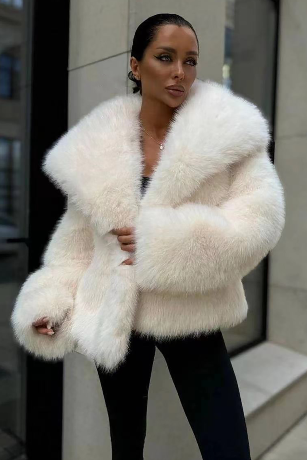 Oversize Turndown Collar Faux Fur Long Sleeve Fuzzy Coat-OffWhite