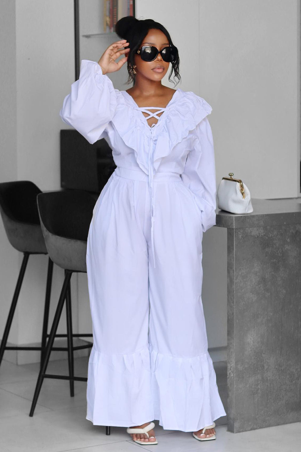Ruffle Lace Up Blouse Wide Leg Pants Casual 2pcs Set-White [Pre Order]