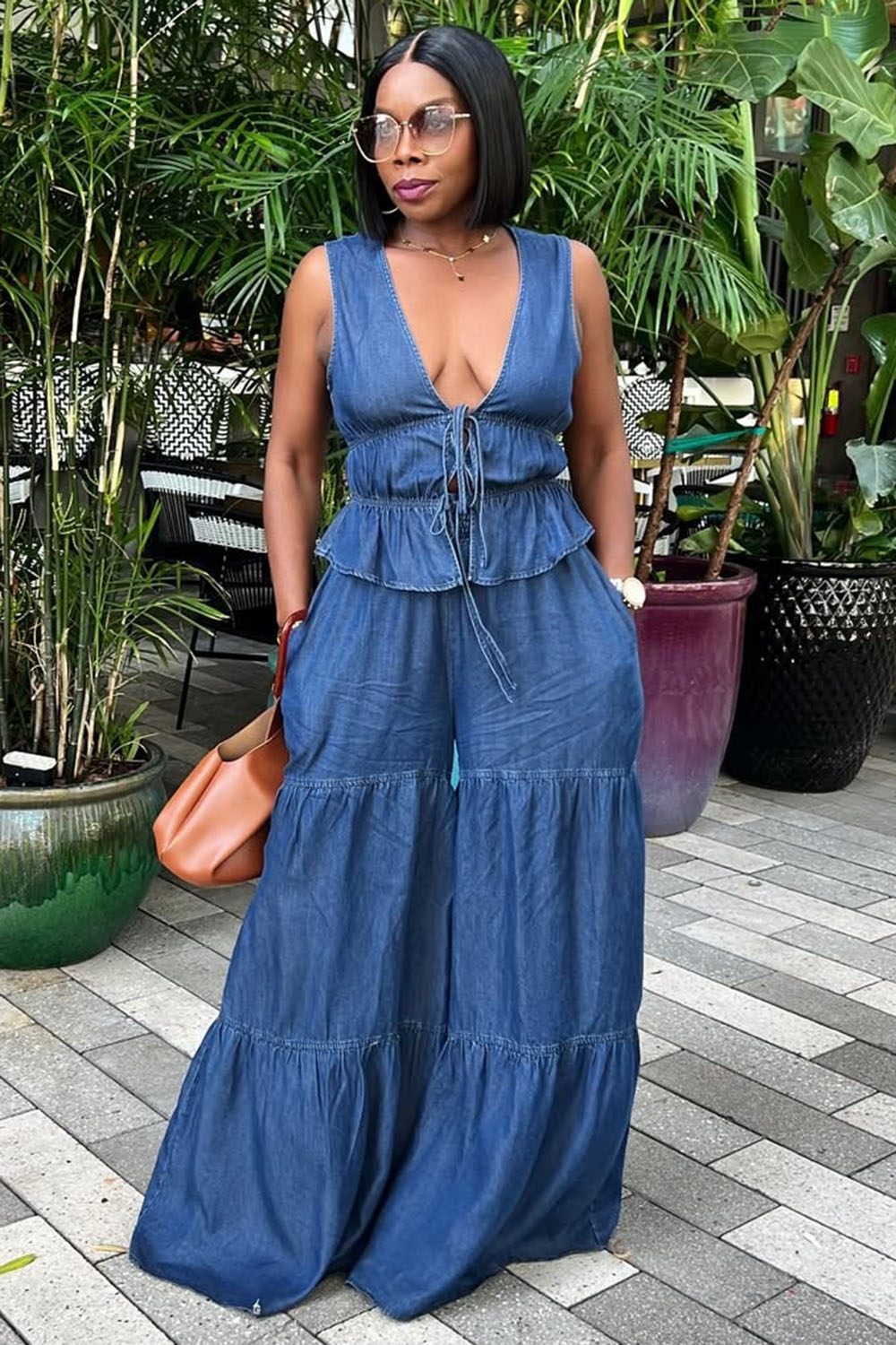 V Neck Peplum Vest Tiered Wide Leg Pants Denim 2pcs Set-Blue [Pre Order]